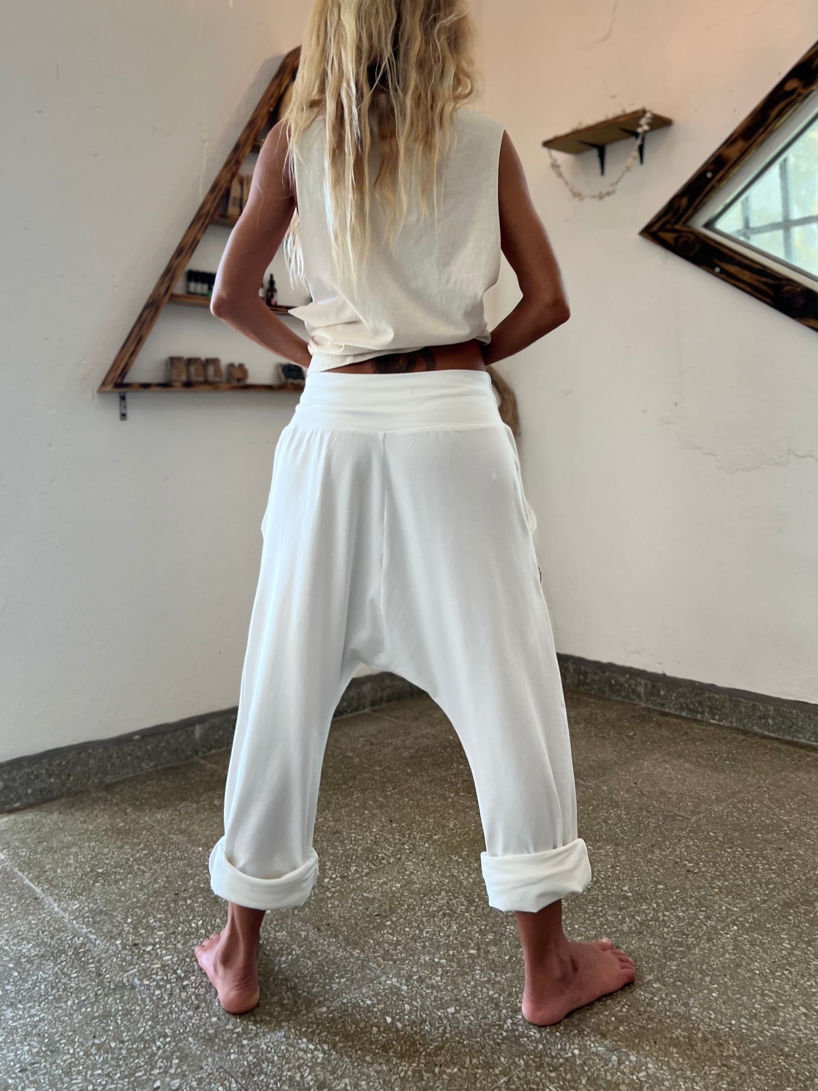 These handmade white drop pants are crafted for movement, comfort, and versatility. Whether you're heading to a festival, a yoga session, or simply moving through your day with intention, they offer an easy fit and a grounded feel.