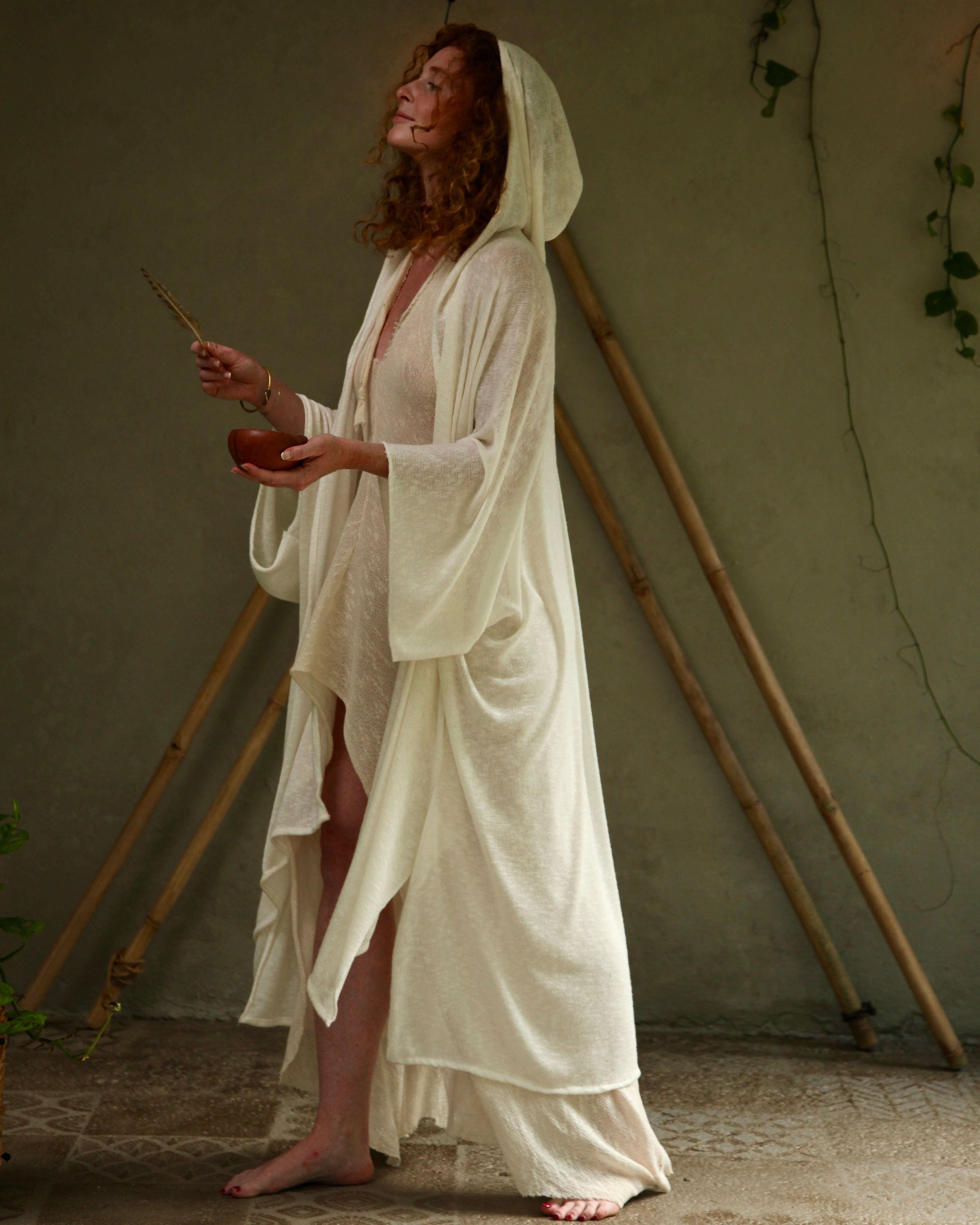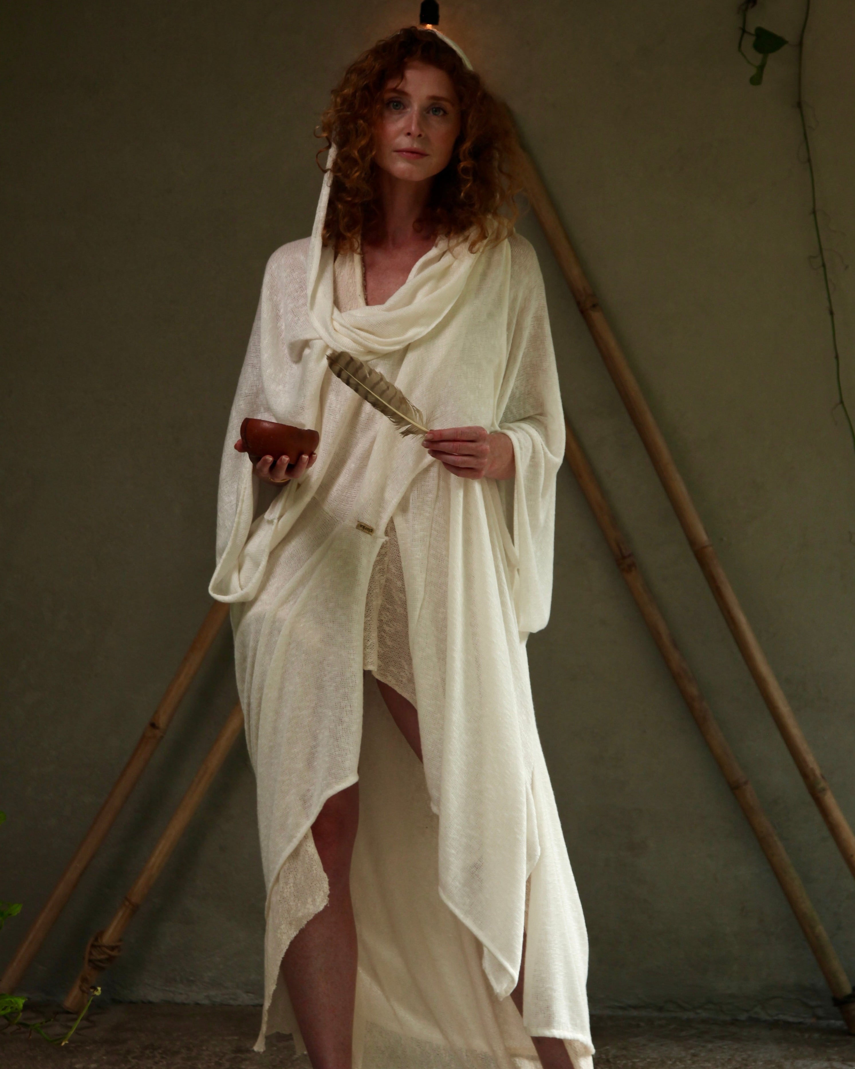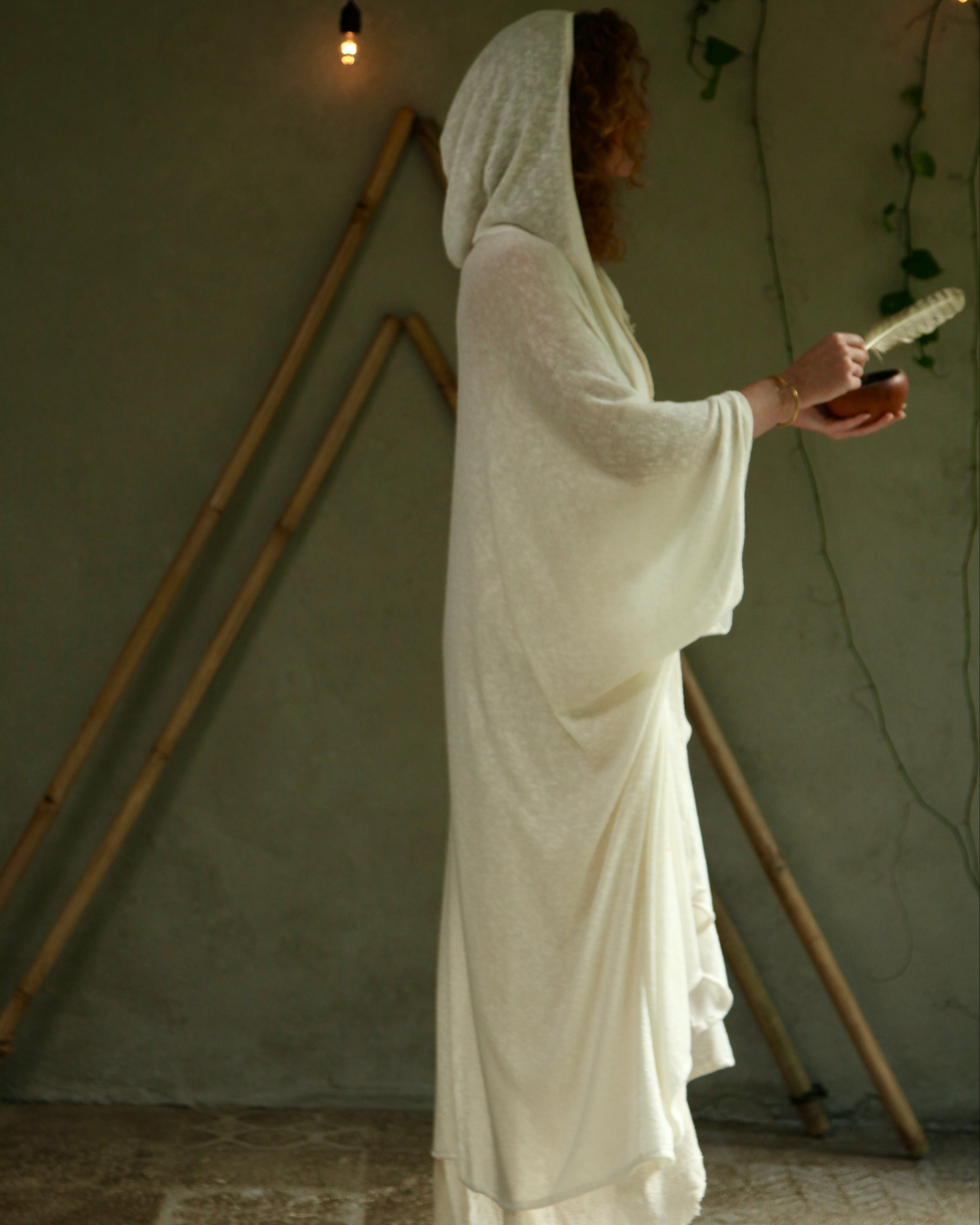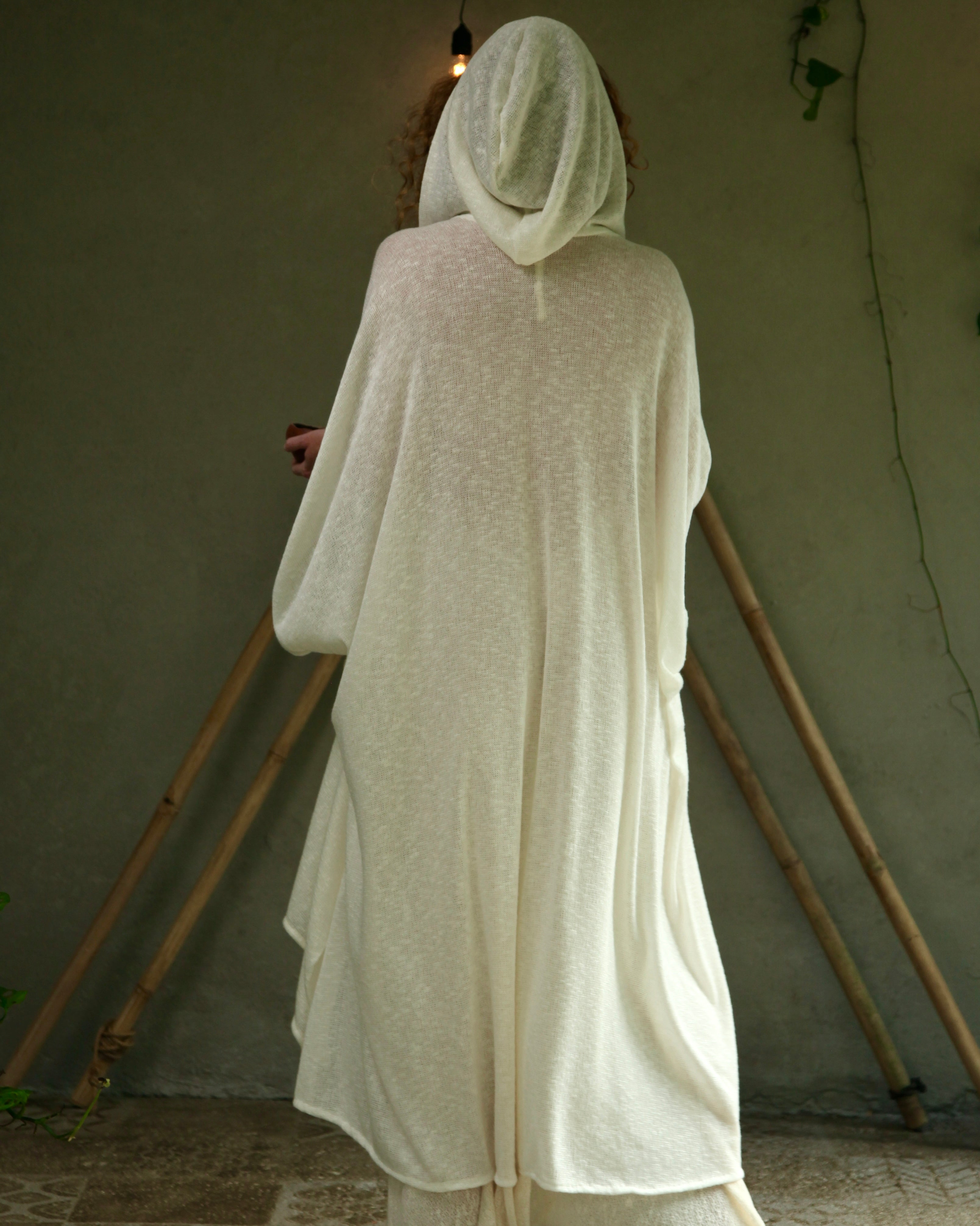Wrap yourself in softness and serenity with this handmade hooded shawl, crafted from ethically sourced limited edition white cotton knits. Designed for both purity and coziness, it offers a gentle embrace, perfect for layering, meditation, or everyday wear.